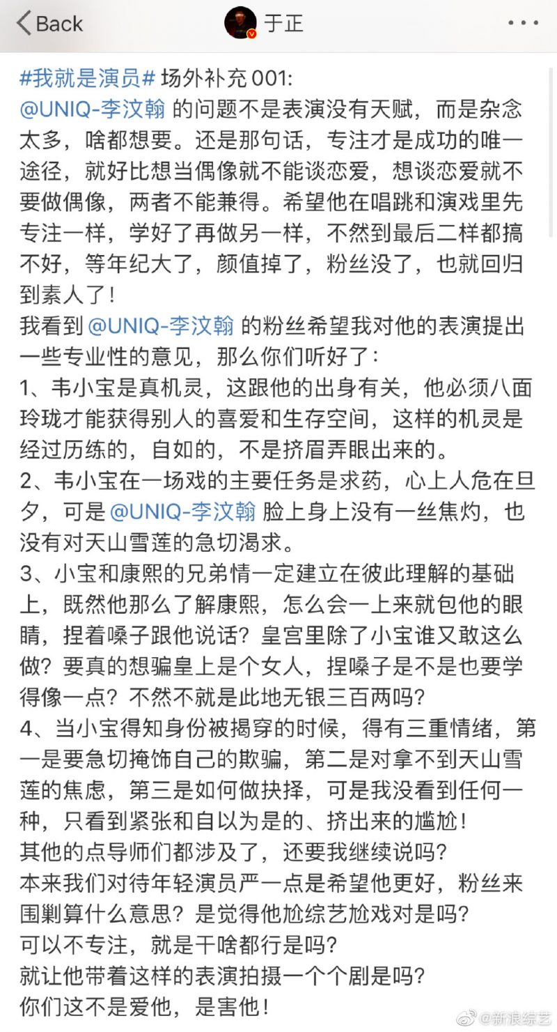 此外,于正也针对李汶翰的表现给出一些专业性的意见,并向对方的粉丝喊话“你们这不是爱他,是害他!”