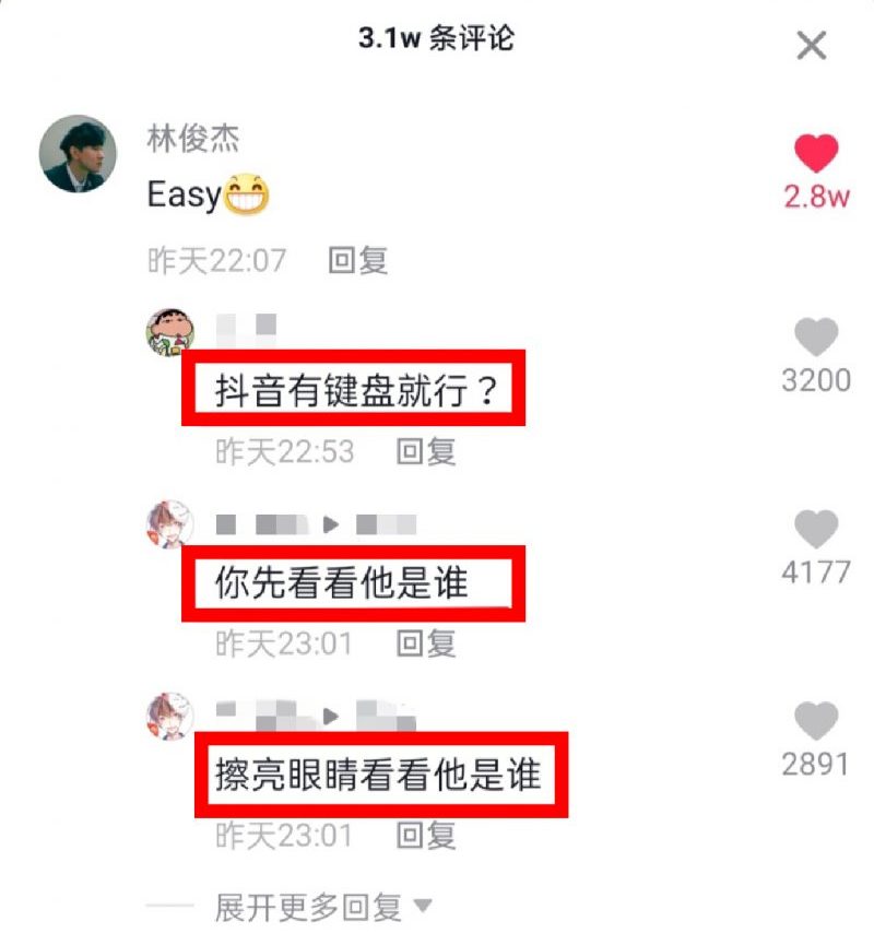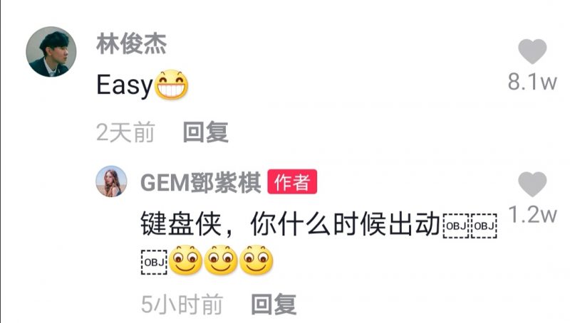 素有“小巨肺”之称的邓紫棋轻松挑战成功,并引来了林俊杰在底下留言“Easy”,不过却有网友摆了个大乌龙,误以为林俊杰是键盘侠写道:“抖音有键盘就行?”。