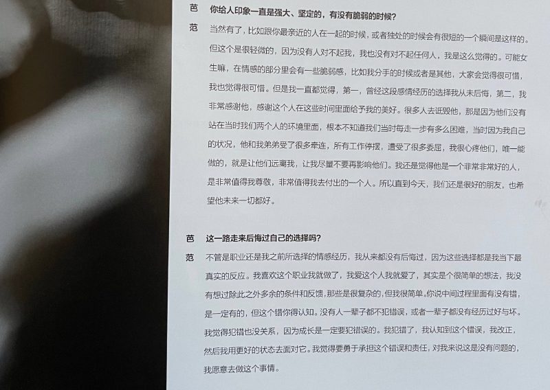 范冰冰透露在事件爆发时很多人去诋毁李晨,“因为他们没有站在当时我们两个人的环境里面,根本不知道我们当时每走一步有多么困难,当时因为我自己的情况,他和我弟弟受了很多牵连,所有工作都停摆,遭受了很多委屈,我很心疼他们,唯一能做的,就是让他们远离我,让我尽量不要影响他们”。