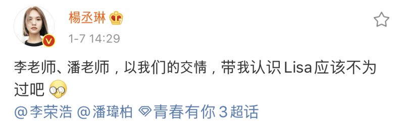 杨丞琳曾在Instagram发限时动态表白和称赞三位韩女团成员,其中一位就是LISA。得知LISA确认加盟《青你3》后,她在微博发文写道:“李老师、潘老师,以我们的交情,带我认识LISA应该不为过吧”。