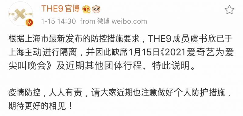 另外,THE9官方微博中午发文宣布虞书欣目前正在上海隔离,因此将缺席今晚的活动以及近期其他团体行程。