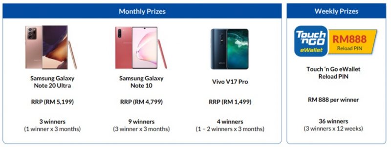 签购配套的客户将自动获得赢取丰富奖品的机会,奖品包括了高额的Touch ‘n Go eWallet充值码以及最新的旗舰智能手机等。丰富的每月和每周奖品如下: