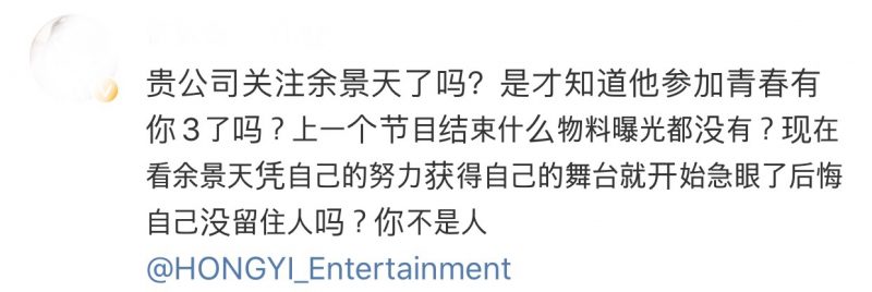 此前,余景天在2019年前往韩国参与M-net选秀节目《Produce 101》,最终以第19名佳绩闯入半决赛,随后还在当地举办个人见面会。据粉丝透露,余景天在《Produce 101》结束录制后公司将近2年没有为他安排工作,也没有任何资源,公司甚至没有关注他的微博账号,因此粉丝对于声明中的“公司在余景天身上倾注了大量精力、财力及情感”感到极度不满。