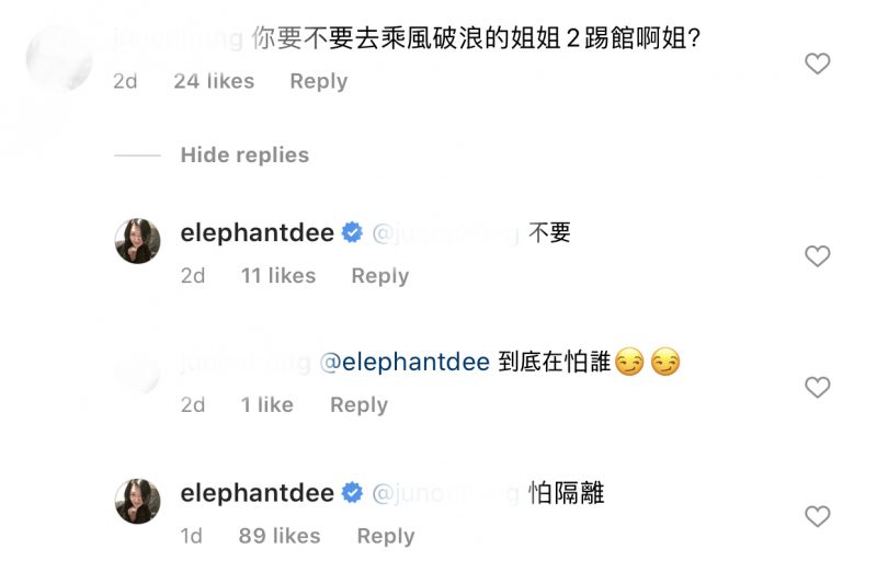 有网友在小S的贴文下留言道:“你要不要去乘风破浪的姐姐2踢馆啊姐?”,没想到她以“不要”两个字火速回应,随后她被追问“到底怕谁”时,小S超有梗回答:“怕隔离”、“不想隔离”、“我不要隔离”,答案直接又中肯,令网友直呼:“人间真实,不愧是S姐”!