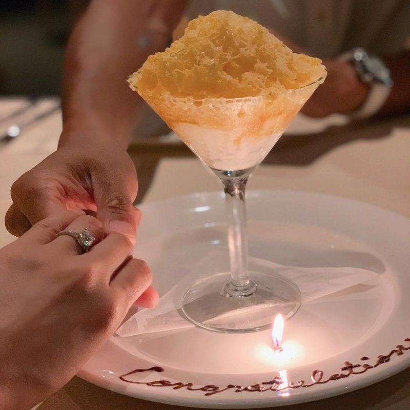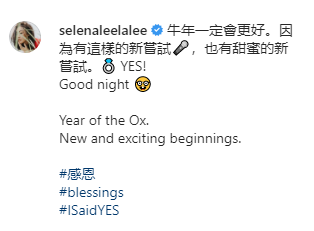 从照片中可见,两人疑似到浪漫又豪华的餐厅用餐,桌上的碟子写着“Congratulation”的字眼,配文写道:“牛年一定会更好。因为有这样的新尝试?,也有甜蜜的新尝试。? YES!”,最后还加上“ISaidYES”的标签。
