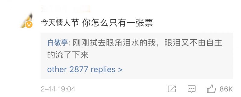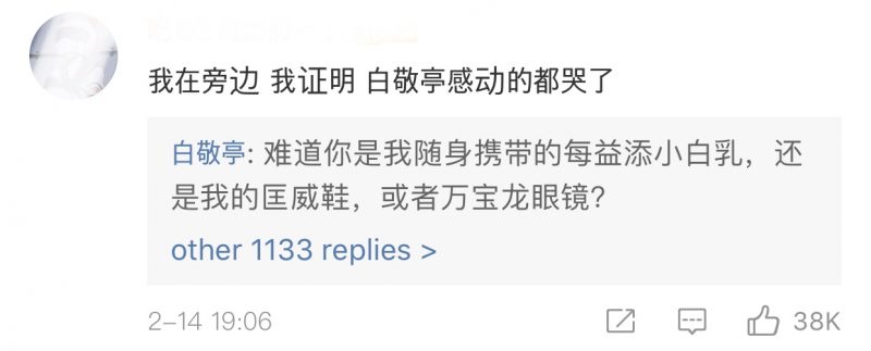 有粉丝问道:“今天情人节,你怎么只有一张票?” 白敬亭回复:“刚刚拭去眼角泪水的我,眼泪又不由自主的流了下来。” 另一位粉丝则表示:“我在旁边,我证明!白敬亭感动的都哭了!”,白敬亭回答道:“难道你是我随身携带的每益添小白乳,还是我的匡威鞋,或者万宝龙眼镜?”