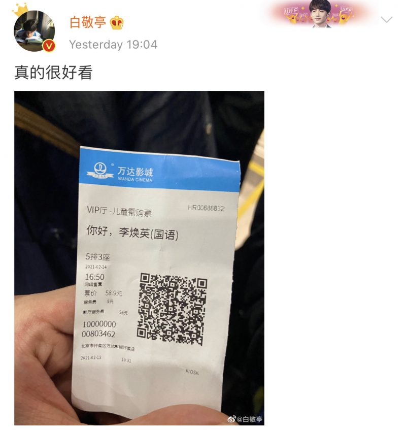 白敬亭在情人节又“搞事情”了!他昨日(14日)在微博晒出一张《你好,李焕英》的电影票根,写道:“真的很好看”,没想到网友的焦点不是放在电影上,而是只有一张票根!
