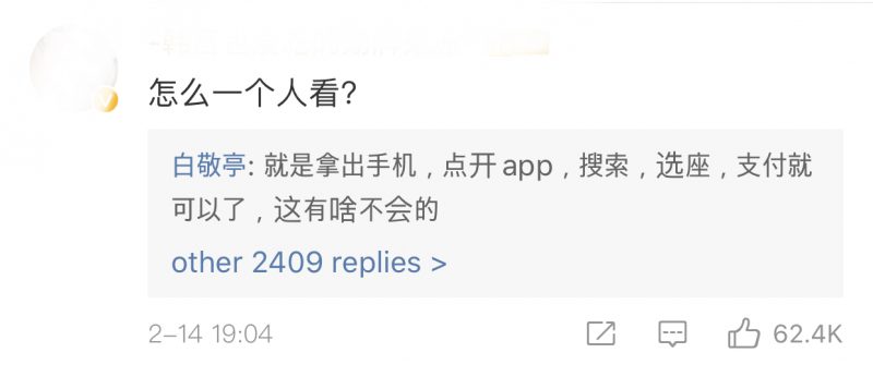 最搞笑的是,有粉丝问:“怎么一个人看?”,于是白敬亭便认真回复,细心附上教程:“就是拿出手机,点开app,搜索,选座,支付就可以了,这有啥不会的?”,毫不敷衍!