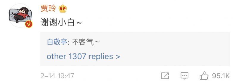 白敬亭在情人节这天到戏院看由贾玲、沈腾、陈赫等人主演的《你好,李焕英》,贴文下吸引不少粉丝前来留言。留言区的热评几乎都是网友调侃白敬亭的评论,而其中一个是贾玲留言感谢他的支持,“谢谢小白~”。