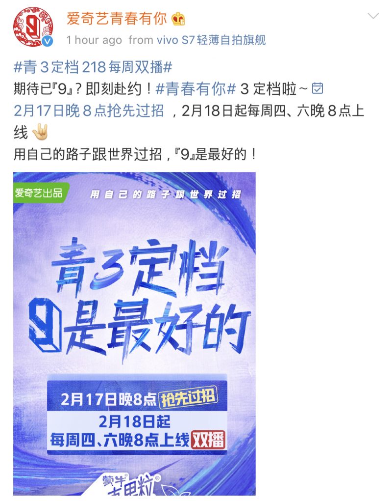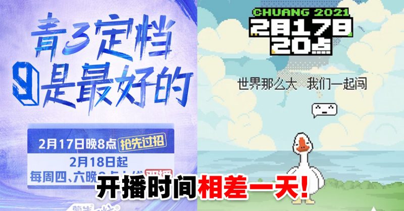 Entertainment娱乐速递节目精选 正面对打!《青你3》、《创4》官宣定档… 仅相差一天 February 15, 2021 选秀综艺《青春有你3》和《创造营2021》终于官宣定档! 由爱奇艺出出品的《青春有你3》今日发布定档海报,宣布将在2月17日(星期三)先导开播,18日起每周四、六晚8时上线! 而腾讯视频《创造营2021》则在昨日官宣定档2月17日晚8时开播,并在首周的周三、周六双更,与《青你3》的播出时间仅相差一天!