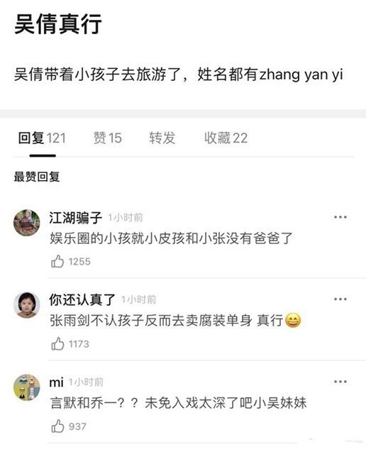 更有网友曾爆料指该小朋友的名叫Zhang Yan Yi,令网友猜测名字是吴倩与张雨剑在剧中角色名字“言默”和“赵乔一”的叠加。
