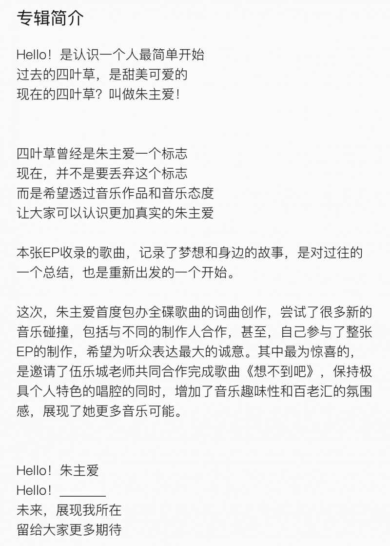 全新EP《HELLO!朱主爱》共收录5首歌曲,分别是《HELLO》、《想写一首歌》、《想不到吧》、《老公公老婆婆》以及《做梦》,并于今日正式上线!