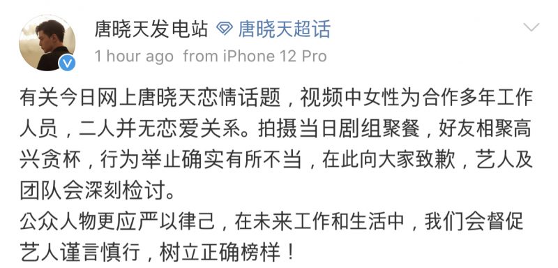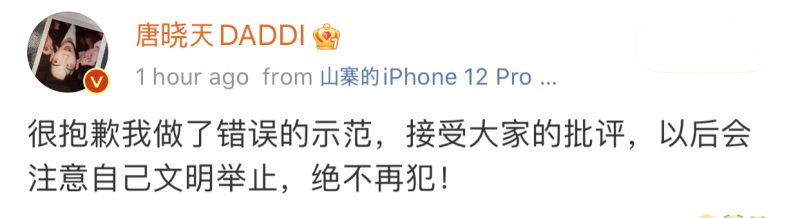 对此,唐晓天于下午发文道歉,称:“很抱歉我做了错误的示范,接受大家的批评,以后会注意自己文明举止,绝不再犯!” 工作室也辟谣恋情,指该女子是合作多年的工作人员,并非恋人。