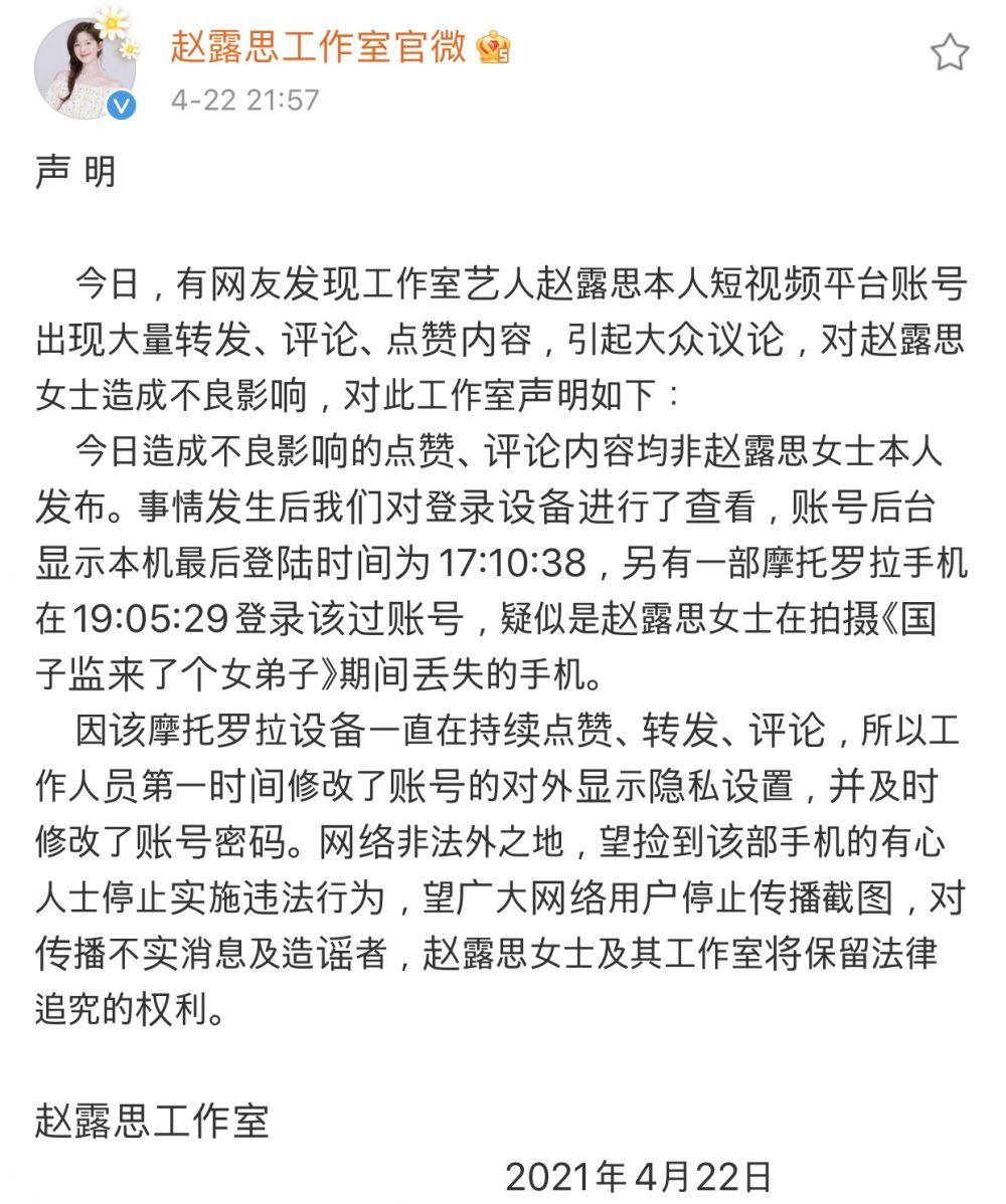 Entertainment娱乐速递 赵露思点赞内涵吴宣仪帖子引争议!工作室回应了! April 23, 2021 赵露思日前被网友眼尖发现在抖音上点赞多条有关内涵吴宣仪的内容,引起争议。对此,其工作室在22日晚作出澄清。 有网友发现,赵露思点赞了大量拉踩吴宣仪的相关内容,比如“吴宣仪抢不过赵露思”、“和赵露思完全不在一个水平上”,并且留言称要转发,还附上“赞”手势,此举动引发网友高度关注,冲上了热搜。 赵露思工作室随后发声明澄清,称相关举动并非有她本人操作。经查看后,账号后台显示一部摩托罗拉手机曾登录过,疑似是赵露思在拍摄《国子监来了个女弟子》期间丢失的手机,同时附上一张登录账户的截图作为证明。