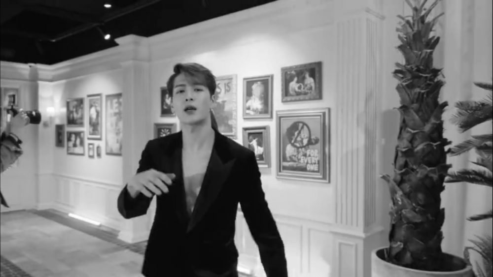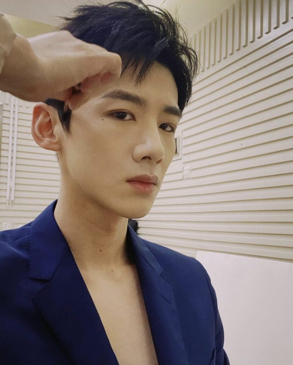 他晒出自己穿着深V的真空西装照,性感十足,写道:“How to make yourself look like @jacksonwang852g7 :Wearing suit without shirt”(怎样让自己像Jackson Wang:穿西装不穿打底就可以了)。