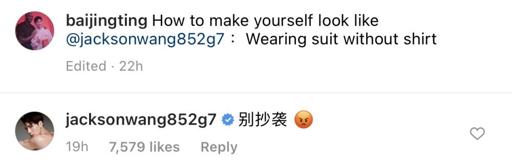 随后,王嘉尔现身评论区回复:“别抄袭”,并配上生气的表情符号。两人的日常调侃逗趣不少网友,表示;“现在要用英文就对了 对啦对啦你赢了”、“哈哈哈哈 王嘉尔:有被冒犯到”、“应该和王嘉尔一样露胸肌吧”、“这两人可以不要那么搞笑吗”、“王嘉尔:哥,你只学到了皮毛”等。