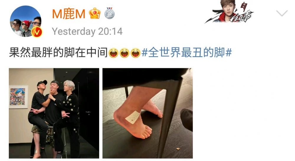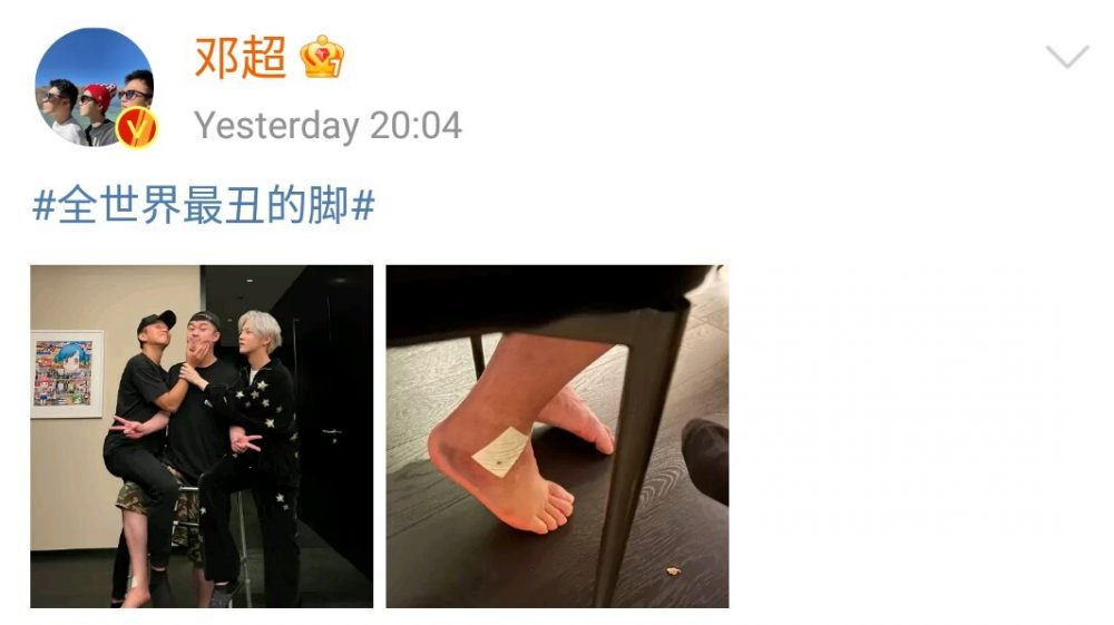 邓超和鹿晗先后晒出三人的合影和陈赫的脚部特写,吐槽:“全世界最丑的脚”、“果然最胖的脚在中间”,而陈赫自夸:“果然好看的,还是在中间”,三人隔空互怼,令网友直呼神仙友谊!