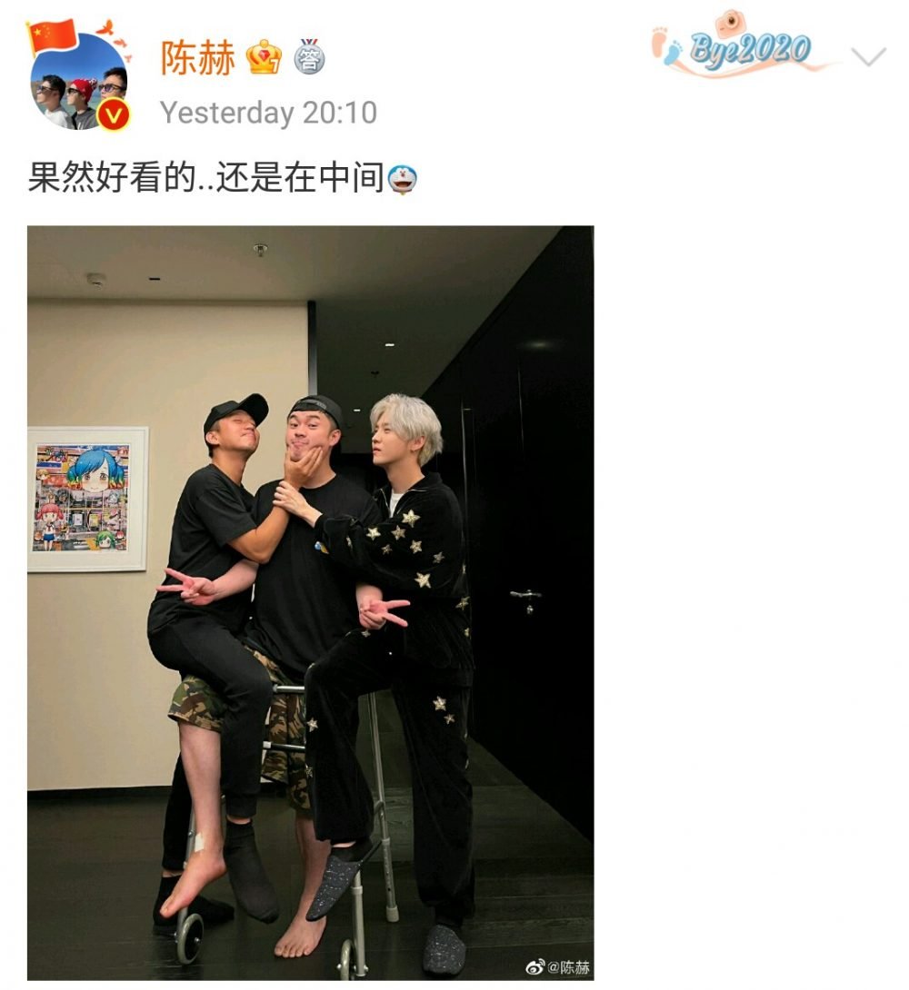 陈赫19日在微博发文透露脚踝手术成功,晒出一张自己躺在病床上摆V的照片报平安。时隔一星期,邓超和鹿晗两位好兄弟一同前去探望陈赫,随后还不忘在线调侃他,不愧是“铁三角”!