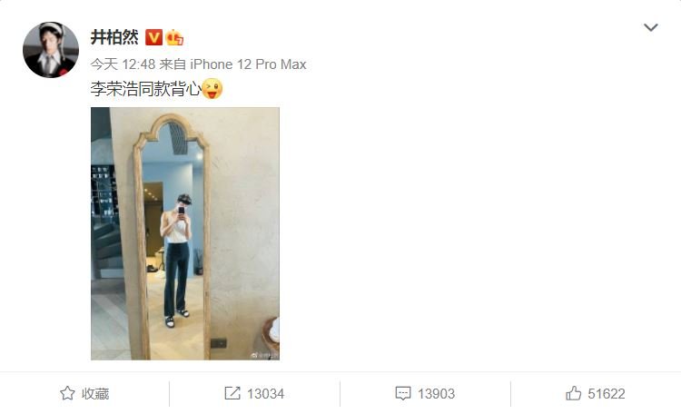 原本事情就这样的平淡的过去了~然而就在隔一天,井柏然在微博也晒了一张自己穿着同款背心,“井柏然李荣浩同款背心 ”更是上了热搜!