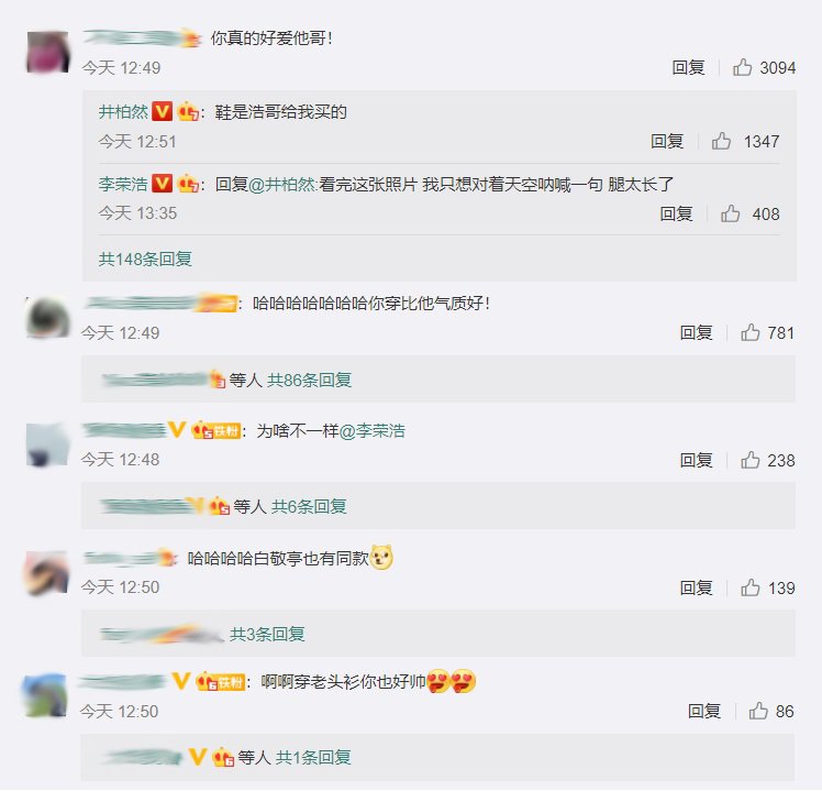 井柏然在留言区表示:“鞋是浩哥给我买的”,而李荣浩看了照片忍不住道:“看完这张照片 我只想对着天空呐喊一句 腿太长了”。可怜的李荣浩被网友和井柏然 “双重击杀”,话说井宝你这样对你哥真的好吗?