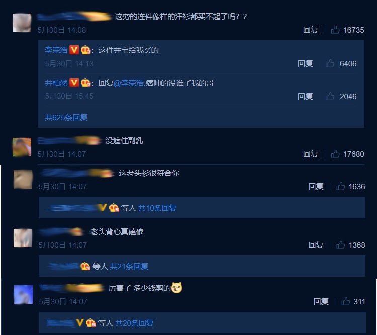 可怜的李荣浩忍不住出来回复:“这件井宝给我买的”,而作为那个买背心的主也在李荣浩的留言下大赞:“痞帅的没谁了的哥”。