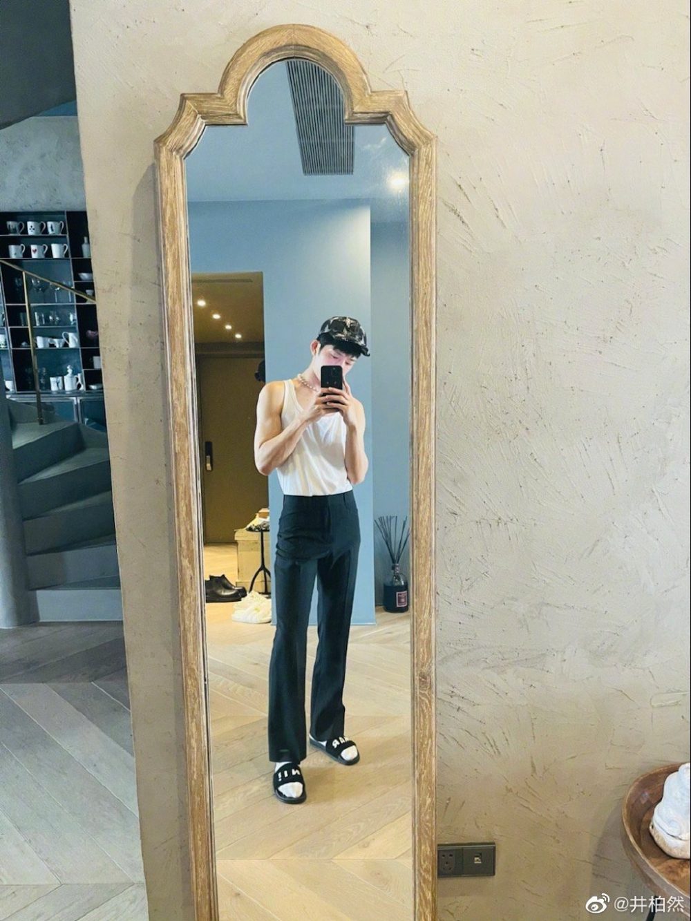 不就是一件普通背心吗?有什么了不起?这你错了!从照片可见井柏然穿着背心大晒肌肉,再配上一双拖鞋,怎么土怎么来,你们说怎么可以土得那么好看呢!?