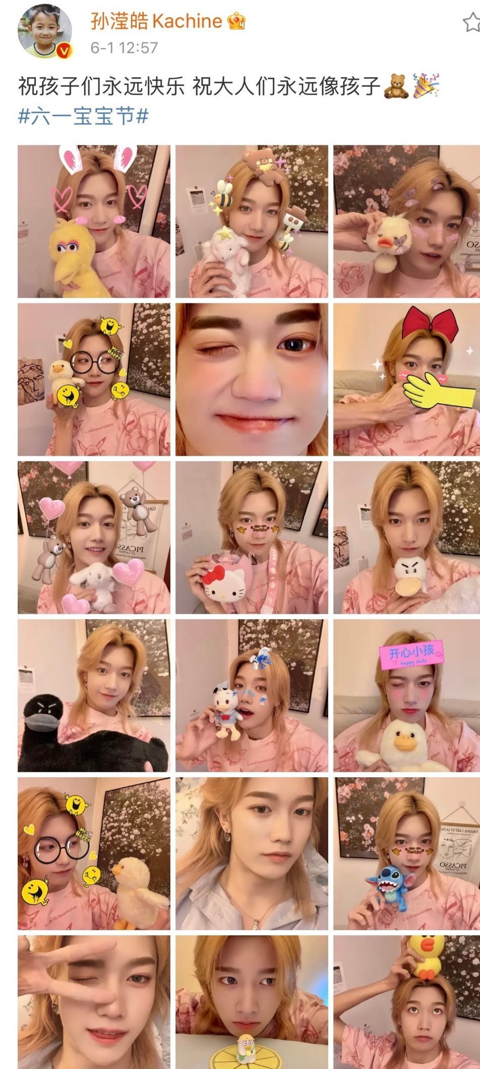 6月1日是国际儿童节,不少明星艺人纷纷在各自的社交账号上更新状态,祝福网友节日快乐。《青春有你3》的训练生孙滢皓也赶上“祝福”列车,在微博上大晒多达18张自拍照,配文表示:“祝孩子们永远快乐 祝大人们永远像孩子”。