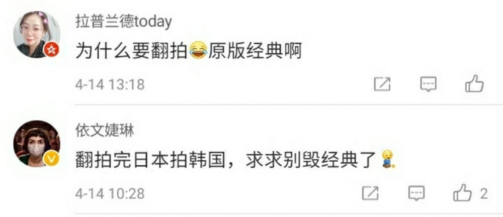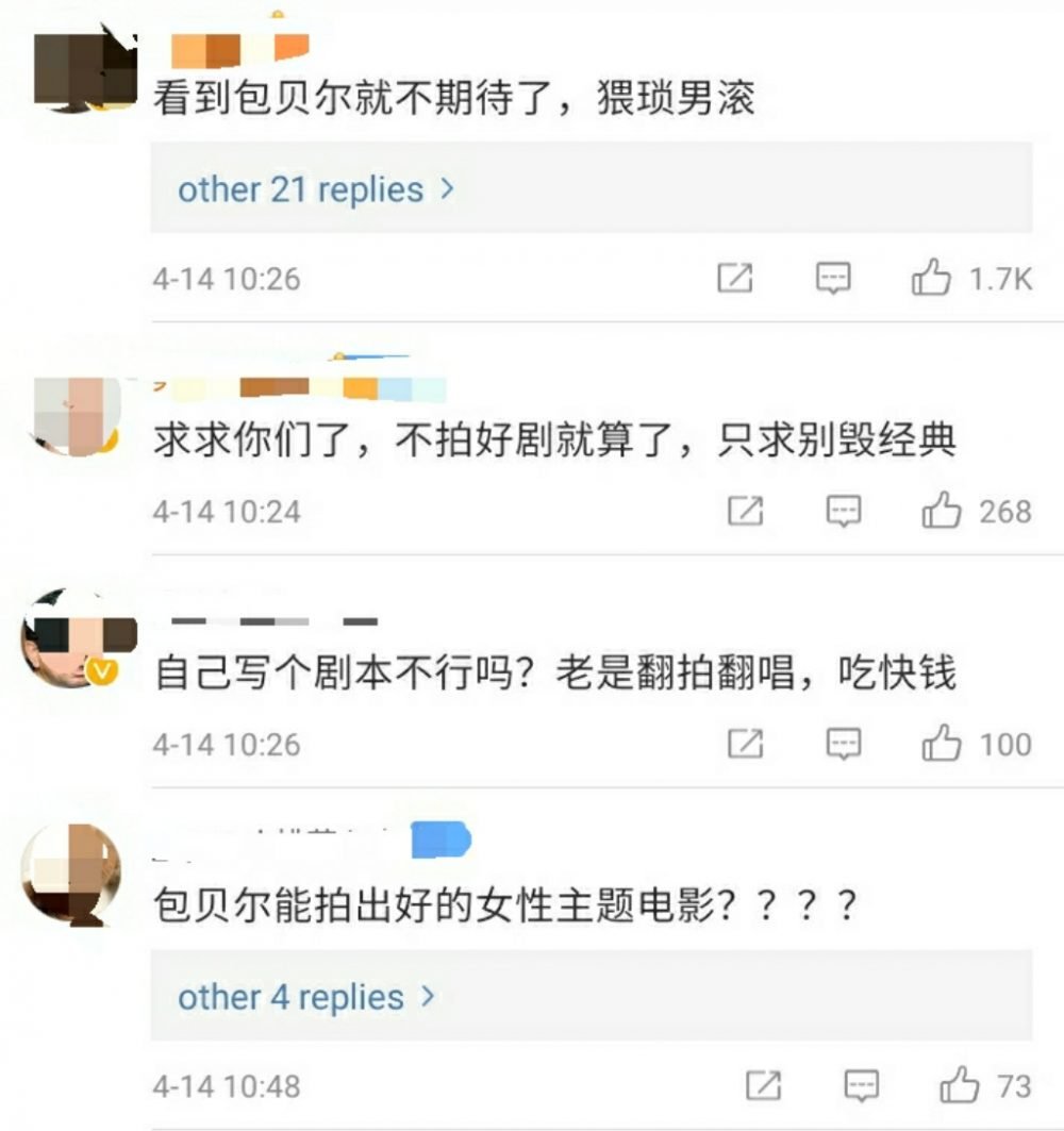 网友们纷纷留言表示:“求你了,别拍”,“出点原创作品不好吗,每年都有多少部翻拍的。”,“为什么要翻拍原创经典啊?”,“现在做导演的门槛那么低了吗?!”,“包贝尔能拍出好的女性主题电影??”。