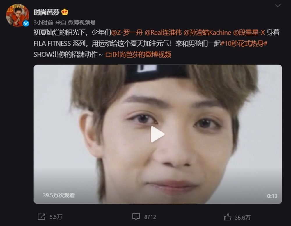 FILA大晒一则短短13秒的视频,配文表示:“FILA FITNESS 系列在少年们的身上尽显活力本色,罗一舟、连淮伟、孙滢皓、段星星用自身的少年感让这个夏天元气满满!快来和他们一起#10秒花式热身# 吧,秀出你的动作,让运动细胞注满全身!”,还艾特了罗一舟、连淮伟、孙滢皓和段星星的微博账号。