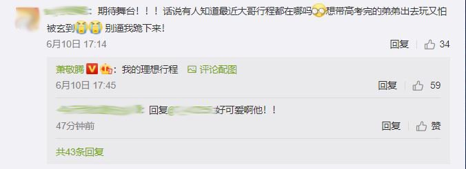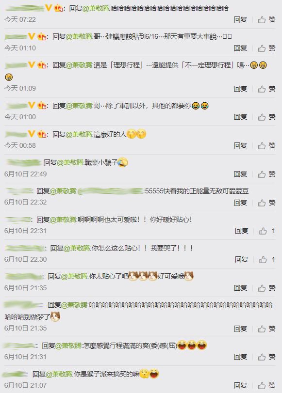 许多网友被萧敬腾与粉丝的互动逗笑了,纷纷表示:“这是理想行程,能提供不一定理想行程吗”、“职业小骗子”、“也太可爱啦”、“你太贴心了”、“你是猴子派来搞笑的吗”,还有粉丝搞笑留言,应该贴到6月16号,那天有重要大事!