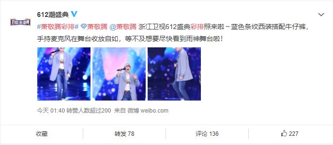 日前,612潮盛典在微博晒出了萧敬腾的盛典彩排照,有网友留言:“期待舞台!!!话说有人知道最近大哥行程都在哪吗?想带高考完的弟弟出去玩又怕被玄到!别逼我跪下来!”