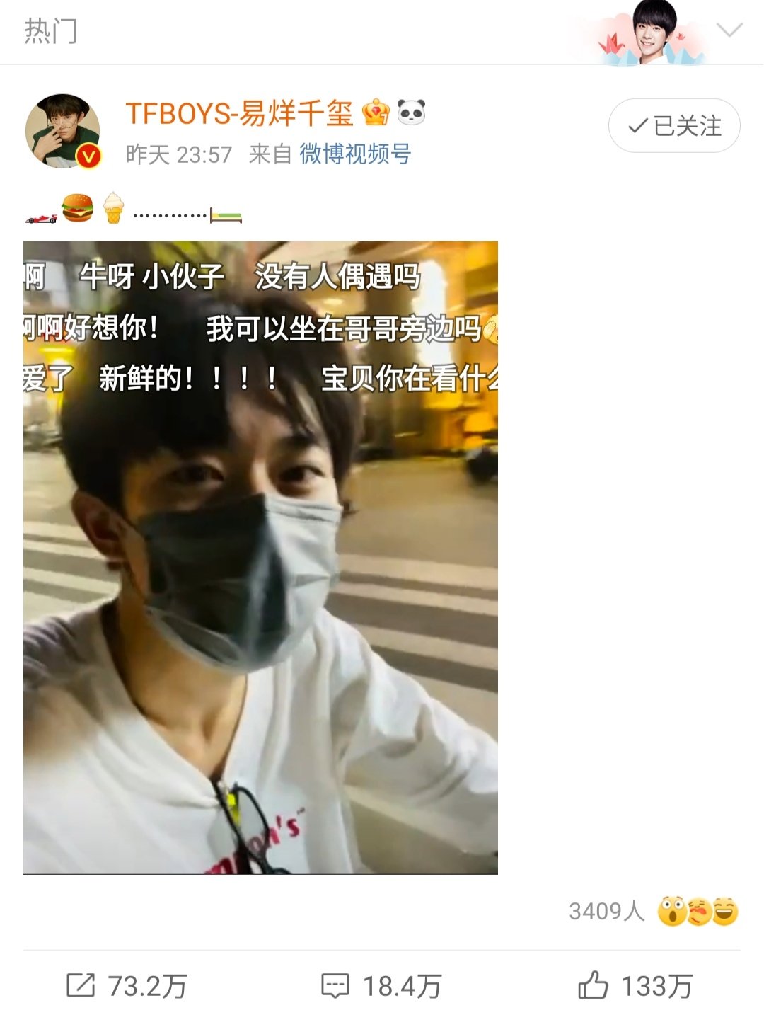 昨夜,易烊千玺在微博个人帐号上发布了一条15秒的短视频,并配了“‘跑车’、‘汉堡包’、‘冰淇淋’…………‘床’”的表情符号。该视频是由千玺自己拍摄的,其内容为身穿白T恤、领口别着一副眼镜并戴着口罩的易烊千玺正开着一辆“BMW”的玩具车在街上兜风,晚风还缓缓吹起他的头发,看起来少年感十足。