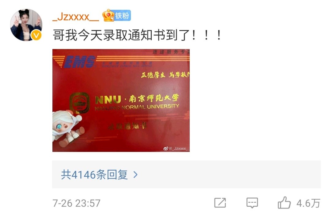 值得一提的是,居然有粉丝在评论区晒出了自己的大学录取通知书,并配文:“哥我今天录取通知书到了!!!”这也吸引了其他粉丝陆续晒出自己的录取通知书,场面十分壮观。网友们都被这一情景感动到,并感叹追星的意义不就是成为更好的自己,大赞千纸鹤(千玺粉丝的统称)们好正能量!