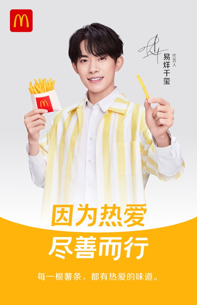 视频中,可以看出易烊千玺身处一条繁华的街道,背景还出现了他所代言的快餐品牌麦当劳(McDonald’s),因此不难猜出千玺所吃的汉堡与冰淇淋应该出自于麦当劳。