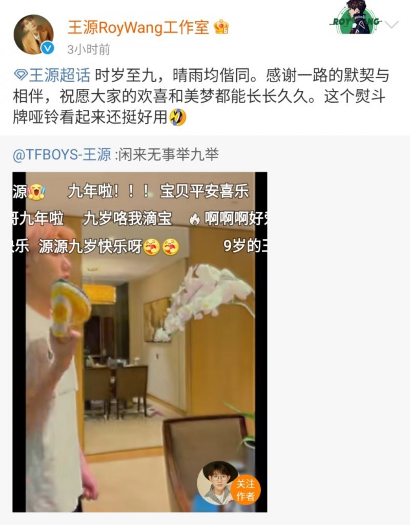 今日,王源在微博个人帐号上发布了一条30秒的短视频,并配文:“闲来无事举九举”,庆祝微博开通九周年。视频内容为粉色头发的王源拿起熨斗举了9下,最后还补上一句:“太轻了,也没有重量”。