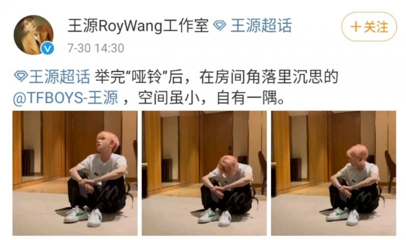 随后,王源工作室微博帐号上传了三张粉毛王源沉思的照片,配文:“举完‘哑铃’后,在房间角落里沉思的王源,空间虽小,自有一隅。”