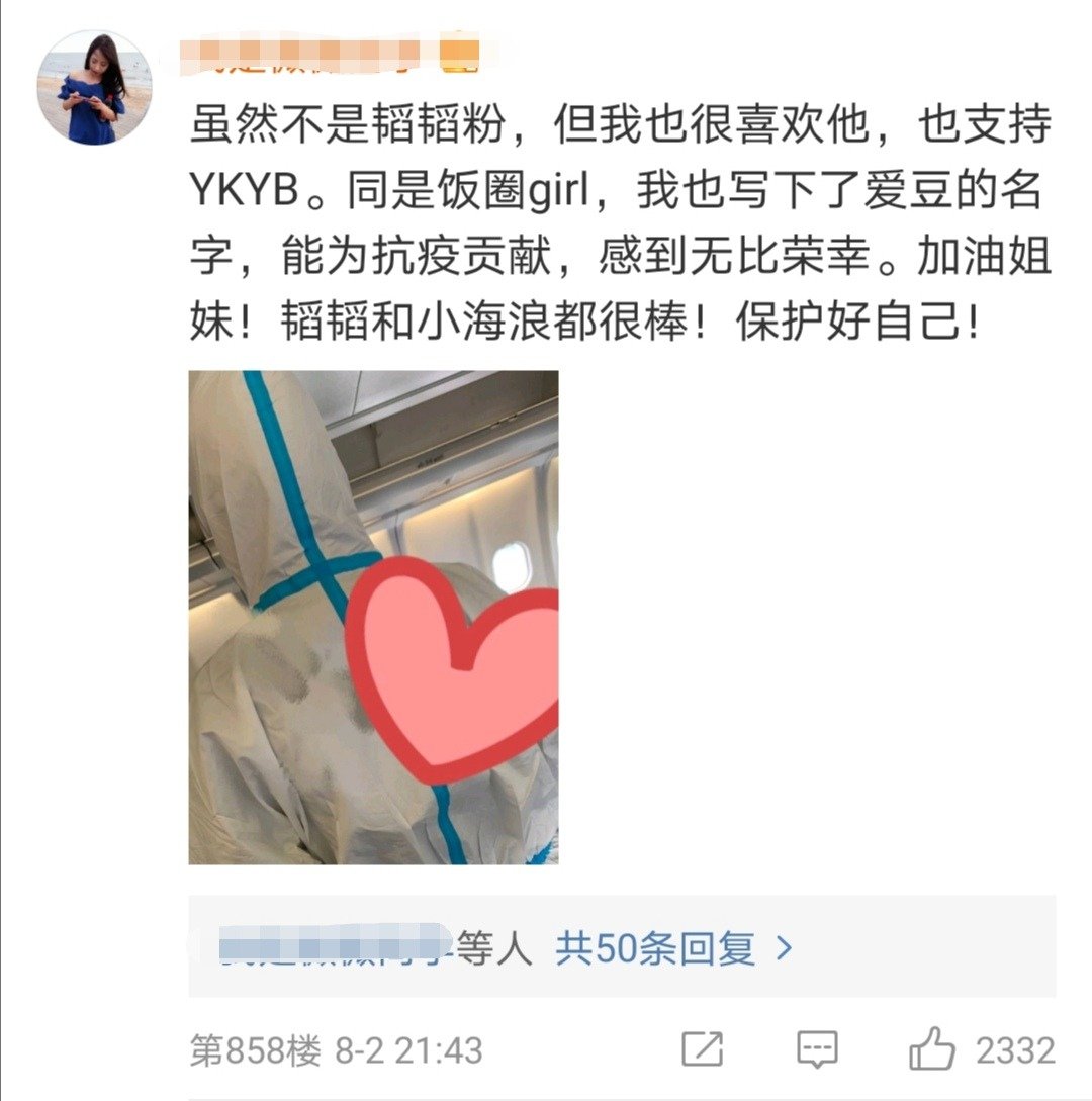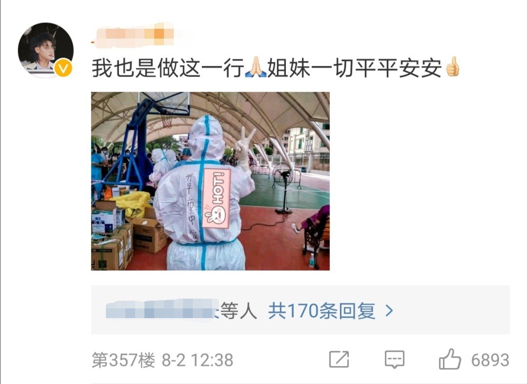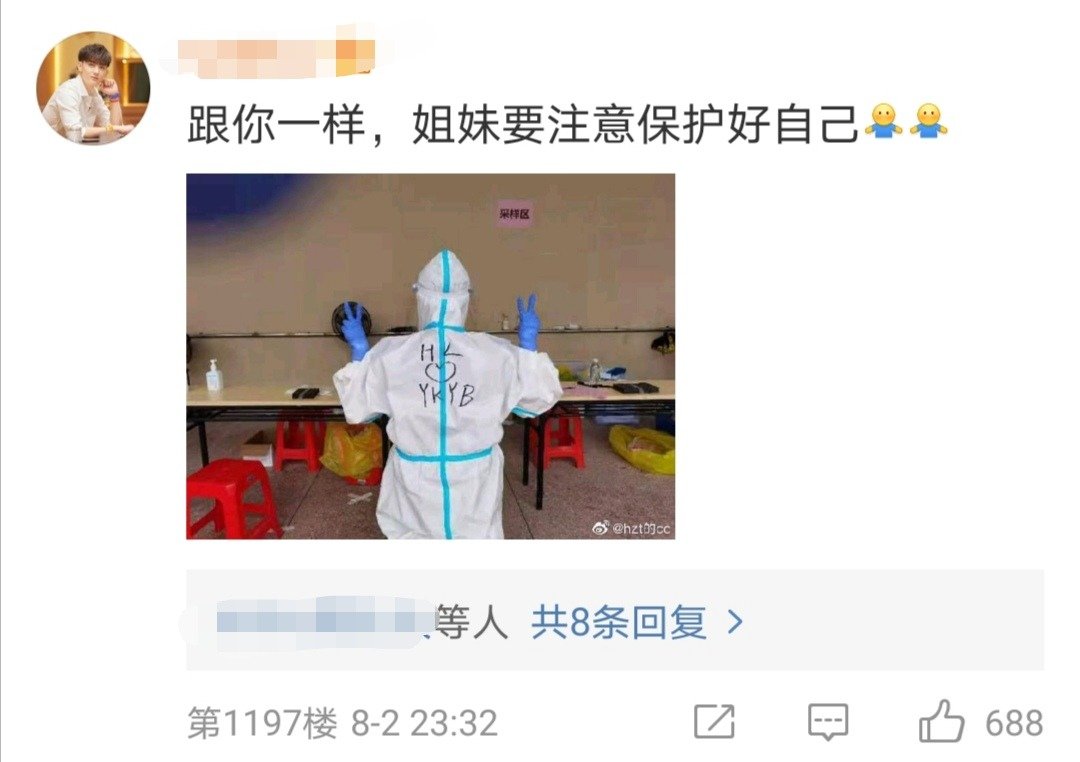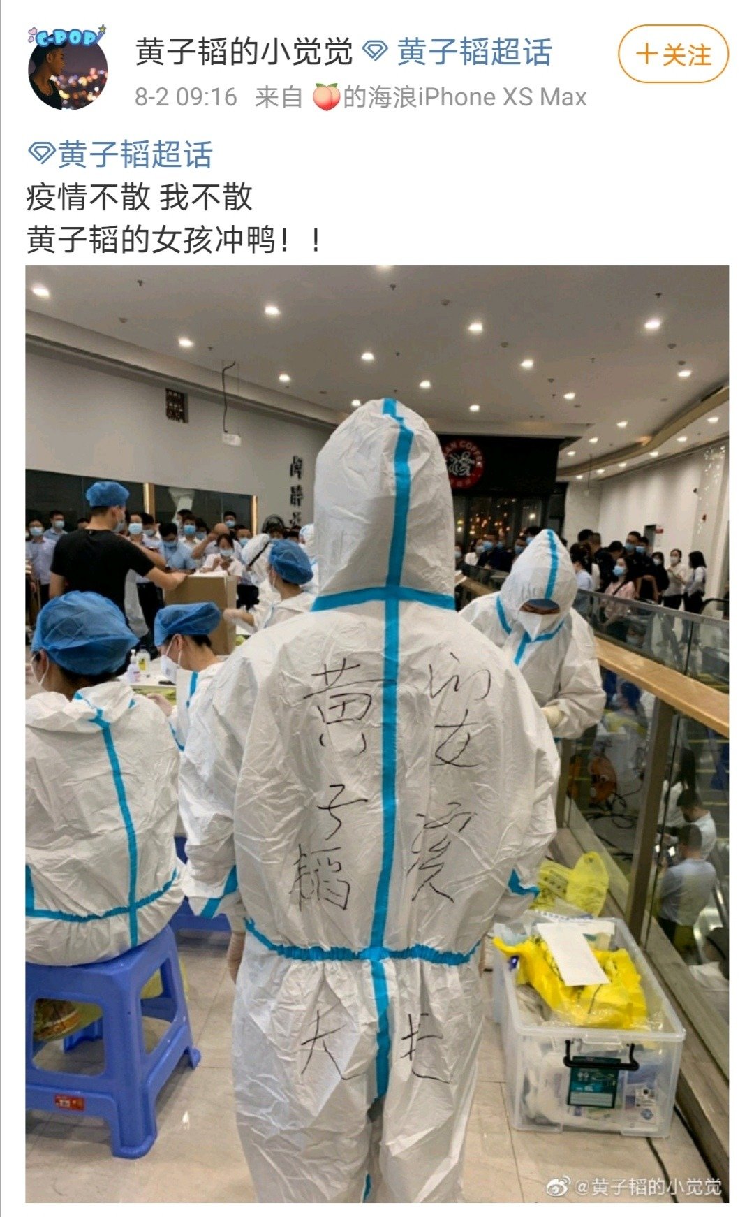 网友“黄子韬的小觉觉”晒出一张背影图,防护服的背面写着“黄子韬”大名,并配文表示:“疫情不散,我不散。黄子韬的女孩冲鸭!!”