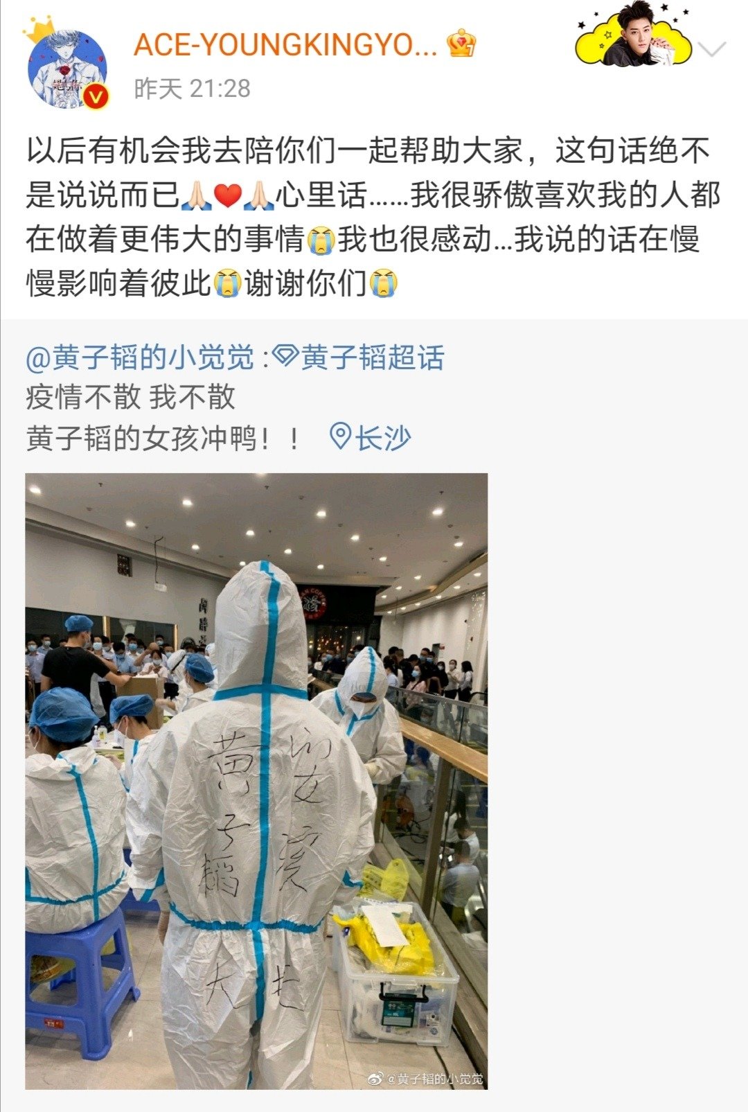 新冠肺炎疫情自去年爆发后,全球各地的疫情局势反复无常。始终不变的是医护人员至今仍然坚守在一线为人民服务。2日,一名抗疫人员在微博发布正能量帖文,引来偶像黄子韬感动回应!