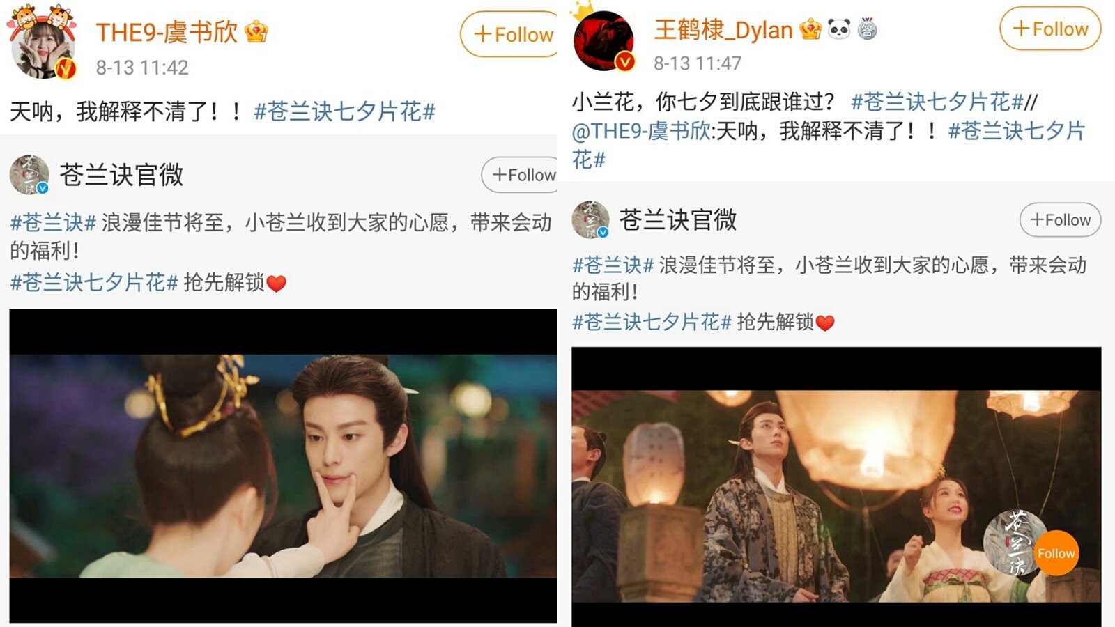 虞书欣其后转发了七夕片花,配文:“天呐,我解释不清了!!”,王鹤棣则转发写道:“小兰花,你七夕到底跟谁过?”