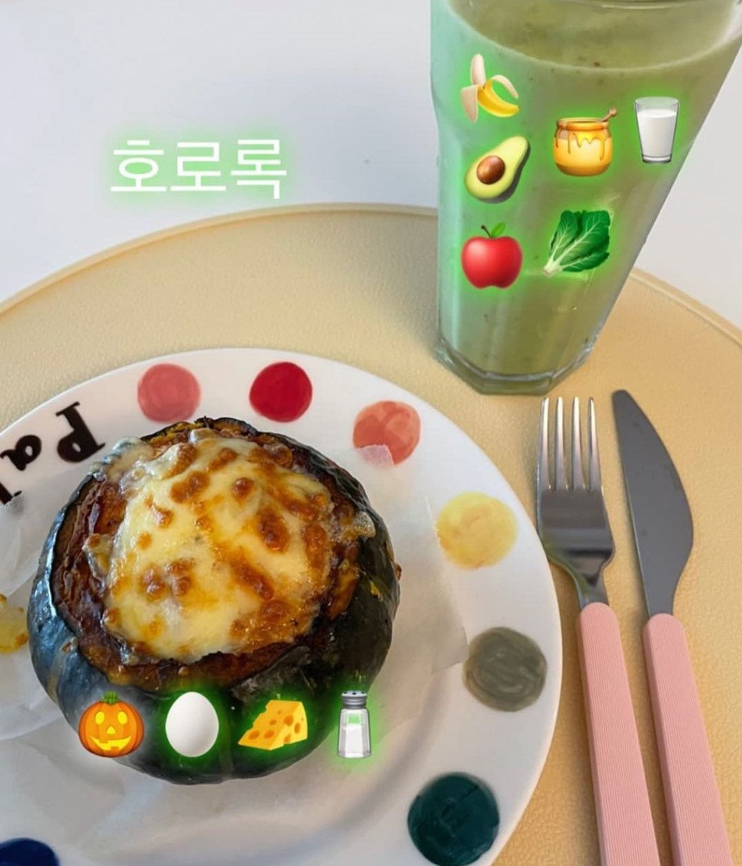 图片中,IU特别利用小图标标出制作食物和饮料的材料,没想到更引人注目的是用来盛装焗烤南瓜的陶瓷盘!