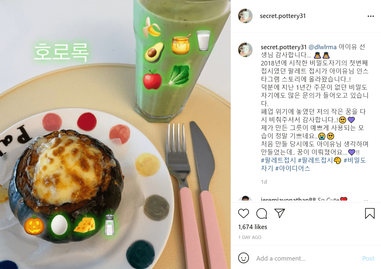 商家在接获大批订单后感性发文表示:“IU真的很感谢你,秘密陶瓷(Secret Pottery)2018年开始制作的第一个陶瓷盘出现在IU您的限时动态。托您的福,过去1年都没有订单的秘密陶瓷(Secret Pottery)收到了很多购买咨询,谢谢您再次照亮我濒临停业的小小梦想。我做的陶器被这么漂亮地使用真的好开心,当时其实也是想著IU制做的…我的梦想实现了!”