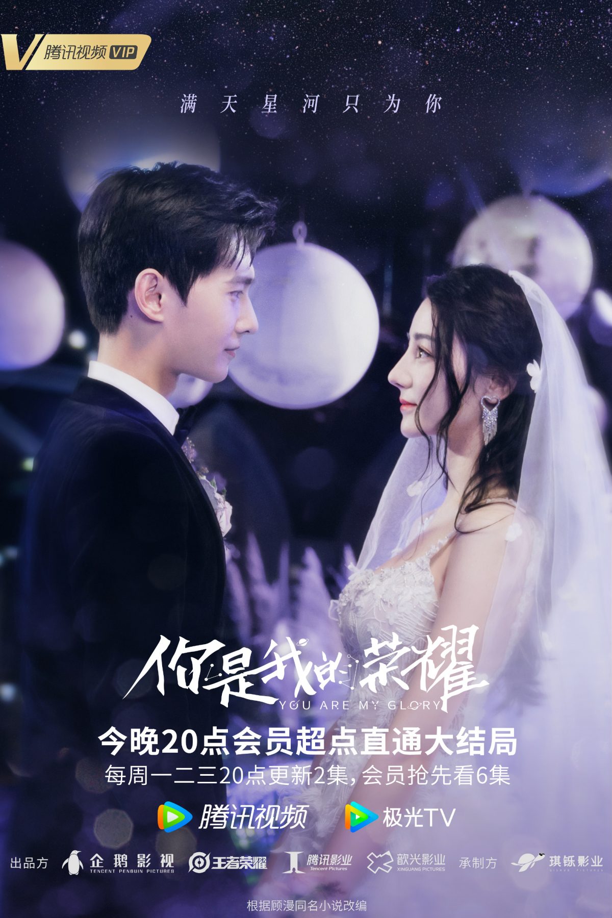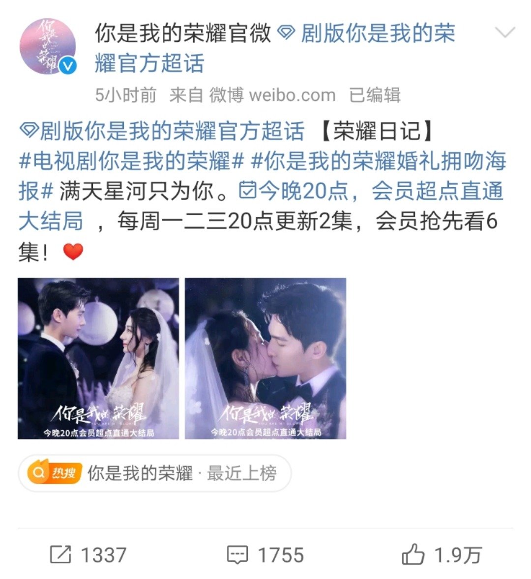 16日,《你是我的荣耀》官微释出两人婚礼拥吻海报,并表示:“今晚20点超点大结局,荣耀夫妇浪漫婚礼现场等你来围观!” 海报上两人身着婚服,彼此深情对望、拥吻,浪漫氛围满满!