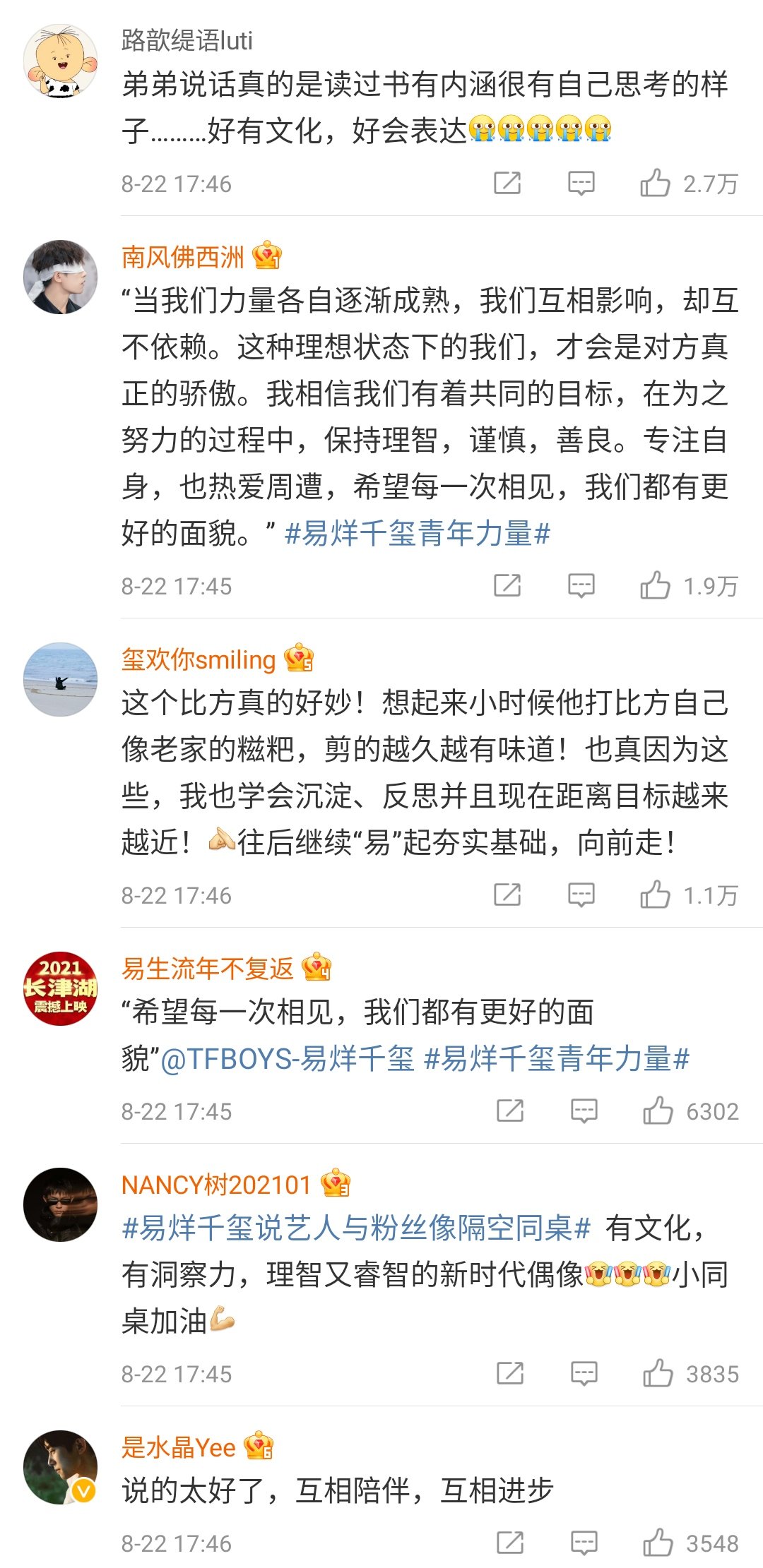 易烊千玺受访报道一出,网友们纷纷被他的正能力所感染,并对千玺的内涵、文化底蕴及其表达能力赞叹不已。