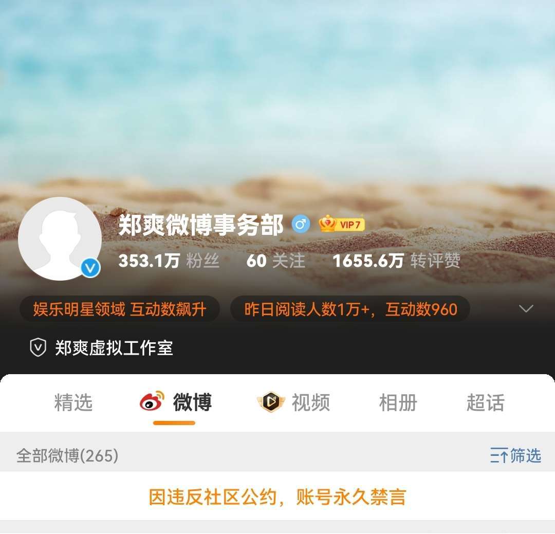 此前广电总局将郑爽列为问题艺人后各官方单位并没有采取实际动作彻底将之封杀。26日,郑爽本人及工作室微博账号均被永久禁言,微博超话已经被关闭。