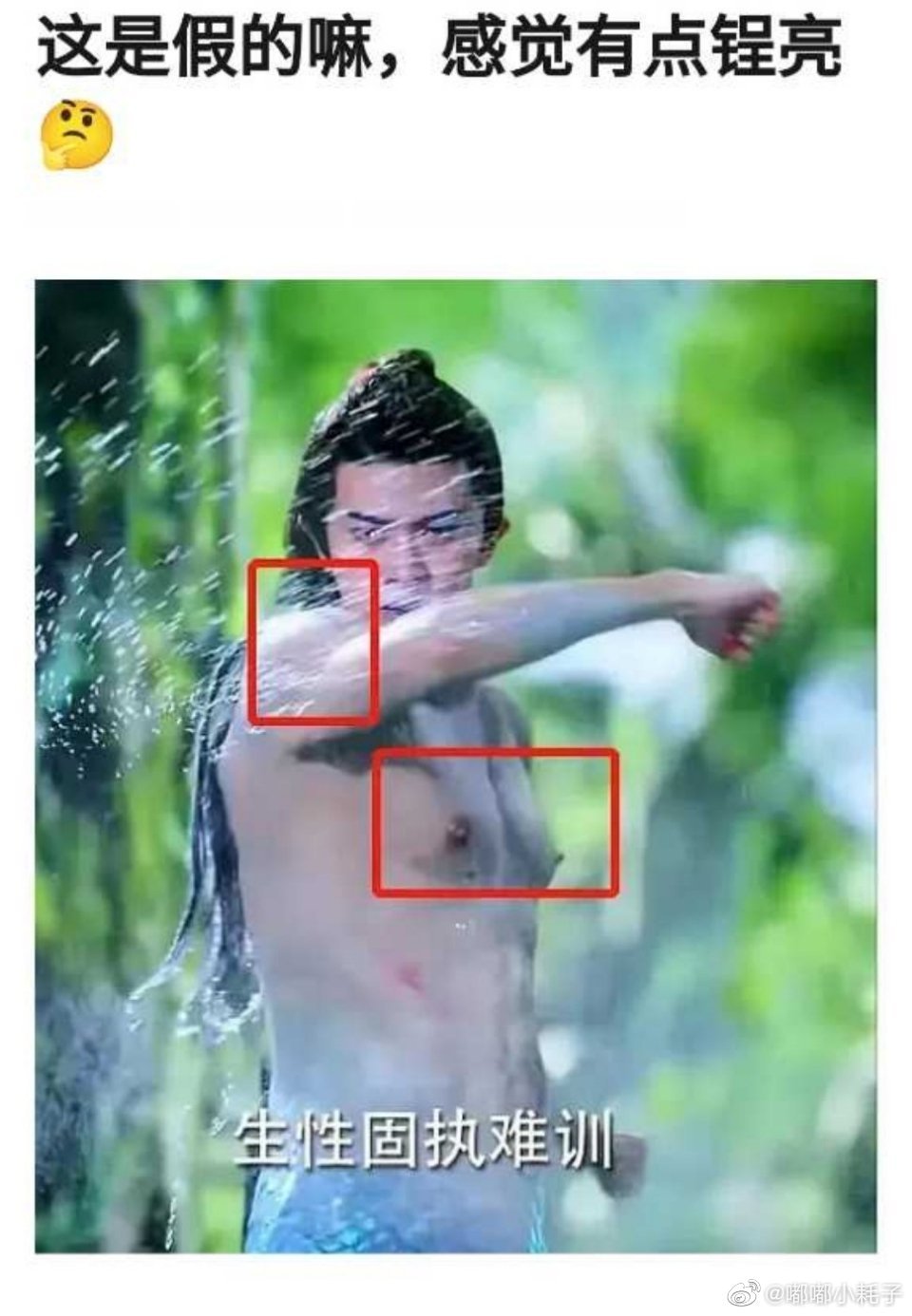 眼尖的网友发现,任嘉伦在从水中出来后,身上肌肉的反光似乎有些不合理,便质疑露出的肌肉是假的。