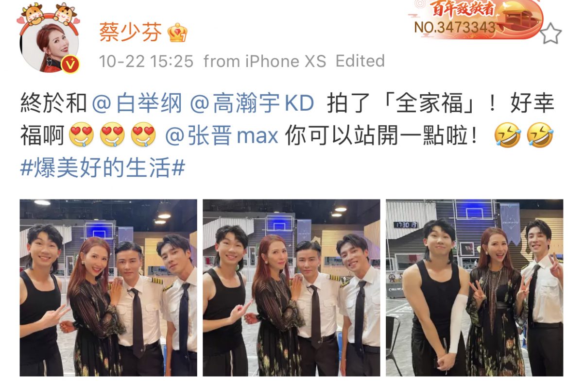 随着昨日的节目播出后,蔡少芬在微博上大晒与张晋及干儿子的“一家四口”温馨全家福,并写道:“终于和白举纲、高瀚宇拍了‘全家福’!好幸福啊”,更搞怪喊话老公张晋:“你可以站开一点啦!”,家庭地位瞬间不保,十分逗趣!
