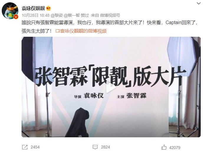 28日,袁咏仪在微博上传一条《张智霖“限靓”版大片》短视频,并配文:“谁说只有张智霖能当导演,我也行,我导演的首部大片来了!快来看,Captain回来了,张先生太帅了!”