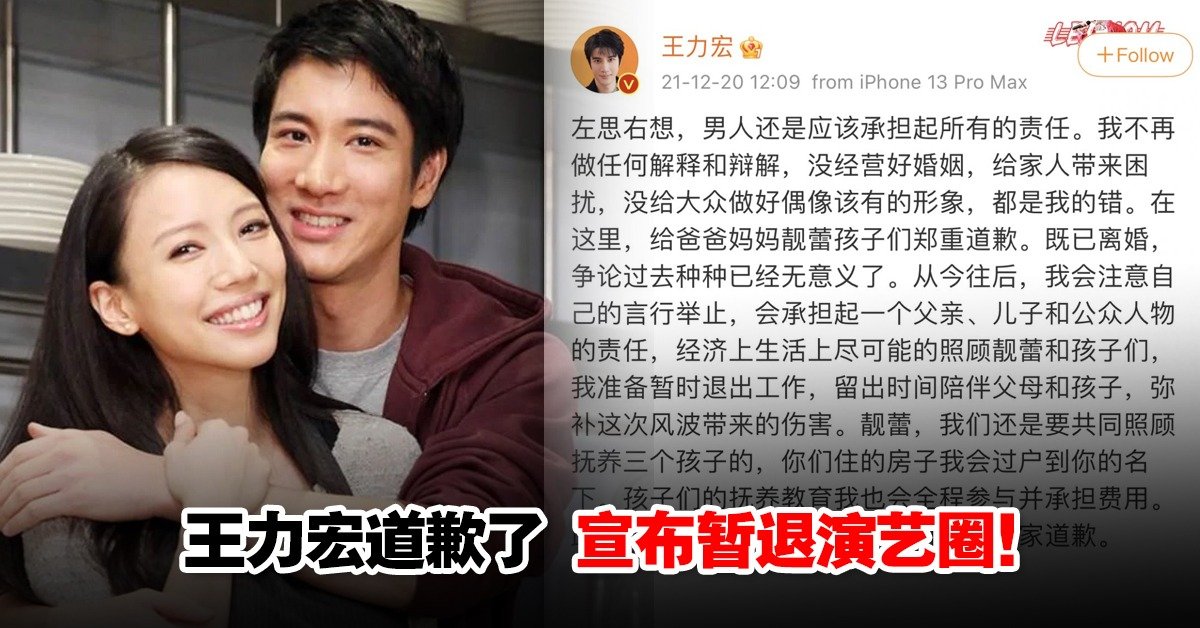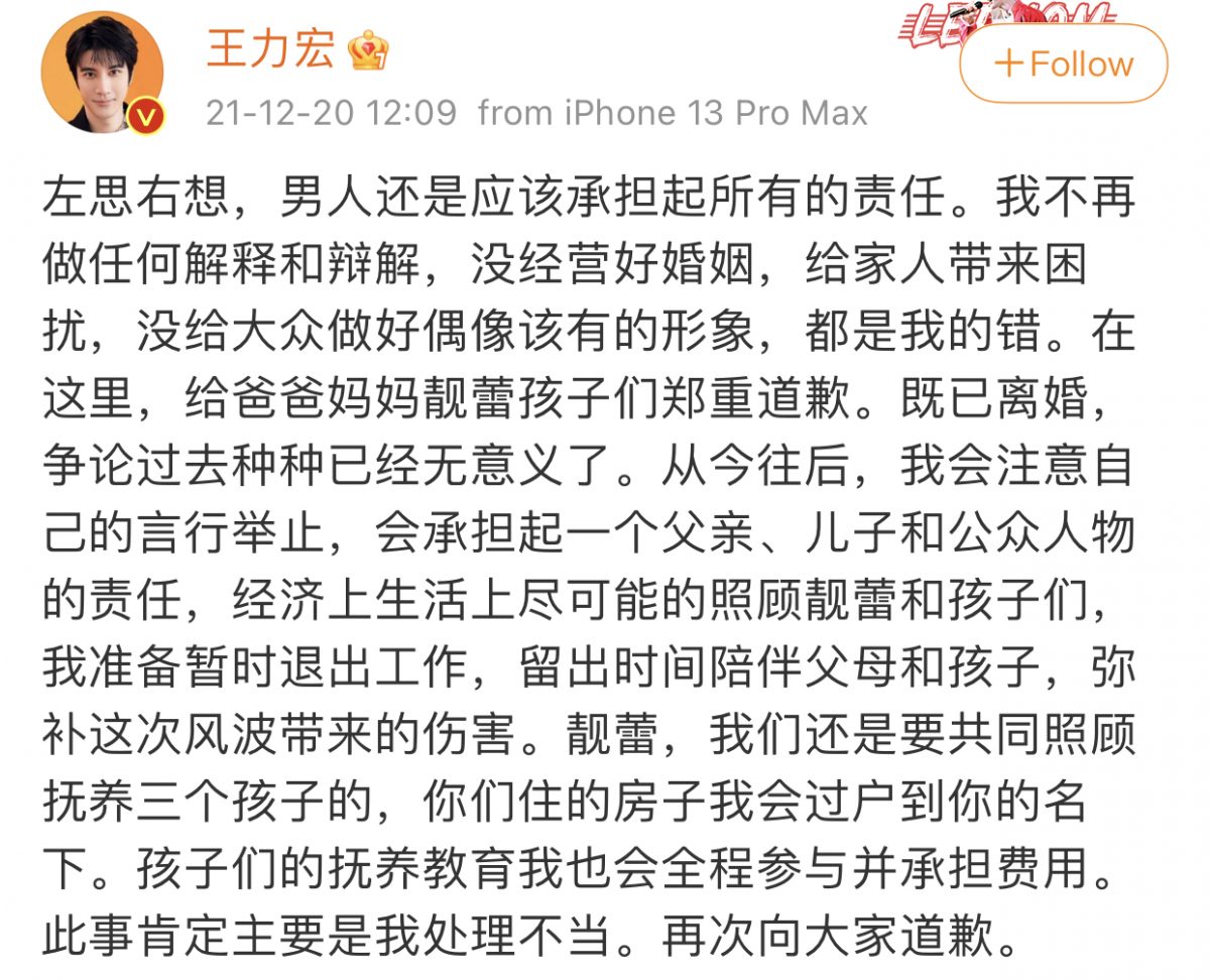 Entertainment娱乐速递 王力宏再道歉并宣布暂退演艺圈!“不再做任何解释和辩解” December 20, 2021 面对前妻李靓蕾今早再度发重锤反击,王力宏中午时分发文公开道歉,表示将不再作出解释和辩解,“既已离婚,争论过去种种已经无意义了。” 同时,王力宏宣布暂时退出工作,并隔空喊话李靓蕾称房子会过户到她名下,孩子们的抚养教育也会全程参与并承担费用。 王力宏本次的道歉声明疑想把事件做个了结,网民对此纷纷开炮调侃:“翻译:不敢犟嘴了 求你别锤了”、“力宏我们相信你,也会一直在你身后默默的戳你脊梁骨”、“翻译一下:我解释不了,爱咋咋地”、“怎么又靓蕾了?不是有日本名吗”等。 全文如下: