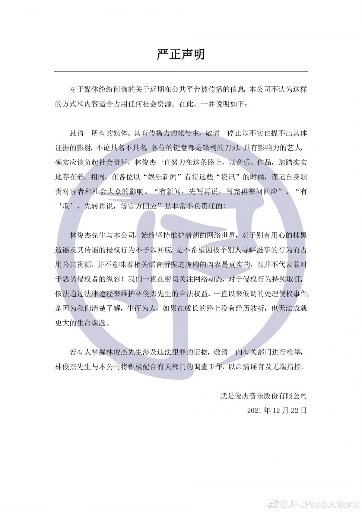 文末更直接放话:“若有人掌握林俊杰先生涉及违法犯罪的证据,敬请向有关部门进行检举,林俊杰先生与本公司将积极配合有关部门的调查工作,以肃清谣言及无端指控。”