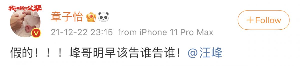汪峰与章子怡结婚6年一向恩爱,经常公开放闪秀恩爱,从未传出不合传闻。该帖文一经曝光,网友纷纷惊呼“世纪大瓜来了”。当晚11时许,章子怡贴出黄安的爆料文截图,并打上又大又红的“假”字否认谣言,配文:“假的!!!峰哥明早该告谁告谁!” 字里行间流露出怒气。